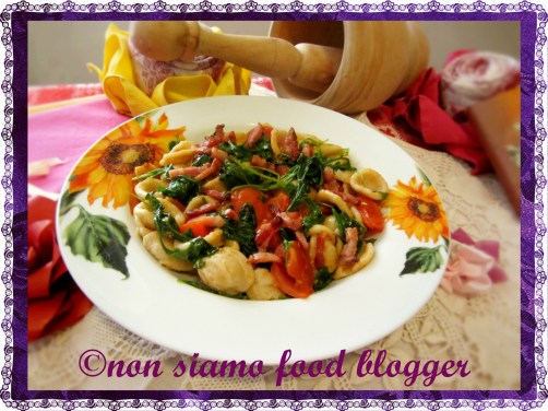 A mio parere l’abbinamento “pomodorini e rucola” è senz’altro uno dei classici del periodo perché è davvero versatile, saporito e rinfrescante. Tempo fa avevamo già proposto una versione fredda di questo piatto, che vede questa “formidabile combinazione” accoppiata alla provola affumicata. Questa volta abbiamo pensato di proporre una variazione che prevede una breve cottura e l’aggiunta di pancetta croccante. Questo piatto è stato preparato per un ospite che non gradiva primi freddi e da allora è diventato una piacevole alternativa alla sopracitata Pasta alla Crudaiola. Colore che non gradiscono la pancetta possono tranquillamente sostituirla con speck, gamberetti, tonno, scamorza, zucchine e…qualunque altro ingrediente solletichi la vostra fantasia!