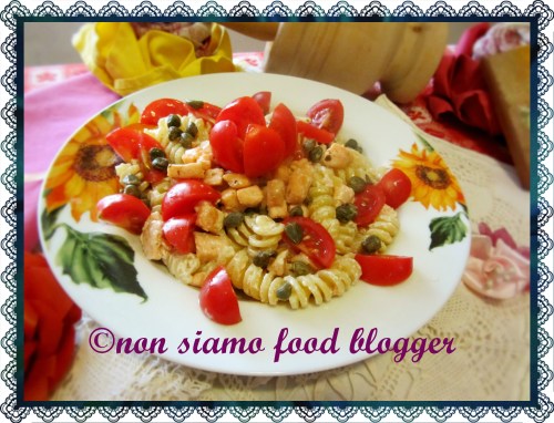 La ricetta che abbiamo scelto di pubblicare questa volta è la “Pasta Fredda al Salmone Fresco con Pomodorini, Capperi e Caprino”. Si tratta di un primo variopinto e saporito, che vede come protagonista uno dei pesci del nord più celebri e versatili della cucina di tutto il mondo: il salmone. Da grandi estimatori del pomodoro fresco abbiamo deciso senza indugio di abbinarlo al salmone; entrambi gli ingredienti si sposano benissimo con il sapore particolare del caprino di capra e – per finire  – il gusto deciso dei capperi completa l’armonia di sapori. Quando non è stagione – come faccio di sovente – sostituisco i pomodori freschi con quelli secchi e, se sono alla ricerca di un abbinamento più “delicato”, prediligo le zucchine al posto dei capperi e la ricotta al posto del caprino.